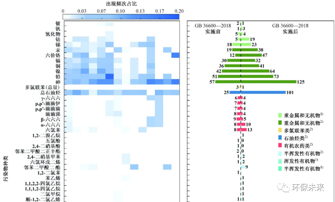 14 種行業(yè)企業(yè)特征污染物的出現(xiàn)頻次占比分布 (見圖 2) 顯示,在收集到的 537 個污染場地中,共出現(xiàn) 60 種污染物. 化學(xué)工業(yè)場地中特征污染物多樣,幾乎涵蓋了 60 種污染物中常見的污染物,包括苯系物、多環(huán)芳烴、重金屬、農(nóng)藥及石油烴等,這與已有研究結(jié)果[25-26] 一致. 金屬制品的主要污染物是 Ni、Cr6+、Cu、Cd、As 和 Pb 等重金屬,其中 Ni、Cr6+占比較大. 鋼鐵行業(yè)和金屬表面處理及熱處理加工場地涉及金屬熱處理、表面處理、機(jī)械加工等工藝,粉塵、煙塵等污染物的不當(dāng)處置導(dǎo)致 Pb、Cu、As、Zn 和 Ni 等重金屬的產(chǎn)生[27-28]. 黑色冶煉的主要污染物是苯并 [a] 芘和重金屬 As,有色冶煉的主要污染物是重金屬 As 和 Ni. 金屬冶煉和壓延加工業(yè)場地中,含 As 化合物和焦炭等在工藝過程中的使用,導(dǎo)致 As 和多環(huán)芳烴等污染物的產(chǎn)生[29-30]. 電器制造的主要污染物是重金屬 Pb;其余行業(yè)的特征污染物分布比較零散.同時,在這 14 類行業(yè)中除造紙行業(yè)沒有統(tǒng)計到苯并 [a] 芘以外,其他行業(yè)均出現(xiàn)了多環(huán)芳烴類為主的半揮發(fā)性有機(jī)物,包括苯并 [a] 芘、二苯并 [a,h] 蒽、苯并 [b] 熒蒽、苯并 [a] 蒽、茚并 [1,2,3-cd] 芘和苯并[k] 熒蒽. 值得注意的是,重金屬污染物在不同行業(yè)的分布也很普遍,主要是 As、Pb、Ni、Cu、Cd 和 Cr6+,這與傳統(tǒng)的“五毒元素”相比,重金屬 Ni 替代了 Hg. 除此之外,苯系物為主的揮發(fā)性有機(jī)物和總石油烴類的污染物在不同行業(yè)中也有一定占比. 總之,在我國污染場地開展修復(fù)與管控工作中,多環(huán)芳烴類為主的半揮發(fā)性有機(jī)物作為各行業(yè)中突出的污染物質(zhì),是我國未來場地土壤環(huán)境治理工作的重點(diǎn).2.3 場地污染物管控指標(biāo)的變化特點(diǎn)與大氣和水的污染防治工作相比,我國建設(shè)用地土壤污染防治工作正處于初步發(fā)展階段. 原國家環(huán)境保護(hù)總局于 2004 年發(fā)布了《關(guān)于切實(shí)做好企業(yè)搬遷過程中環(huán)境污染防治工作的通知》,標(biāo)志著我國工業(yè)污染場地環(huán)境管理的起步. 經(jīng)過 10 多年的探索和實(shí)踐,建設(shè)用地普適性的風(fēng)險調(diào)查評估技術(shù)導(dǎo)則類標(biāo)準(zhǔn)和地方政府出臺的風(fēng)險評估技術(shù)導(dǎo)則以及篩選值標(biāo)準(zhǔn)等相互補(bǔ)充,初步形成了包含場地調(diào)查、評估、修復(fù)管控與效果評估多環(huán)節(jié)的建設(shè)用地全過程土壤環(huán)境保護(hù)的標(biāo)準(zhǔn)體系. 在 GB 36600?2018 發(fā)布之前,各省份污染場地在進(jìn)行修復(fù)管控時主要參考HJ 350?2007《展覽會用地土壤環(huán)境質(zhì)量評價標(biāo)準(zhǔn)》和 DB 11/T 811?2011《場地土壤環(huán)境風(fēng)險評價篩選值》等起步較早和先行的地方管理標(biāo)準(zhǔn)為主體的標(biāo)準(zhǔn)文本;在 GB 36600?2018 發(fā)布之后,各省份污染場地在進(jìn)行修復(fù)管控時則主要參考該標(biāo)準(zhǔn),并結(jié)合一些地方標(biāo)準(zhǔn)開展場地管理工作. 這些標(biāo)準(zhǔn)中的篩選值和管制值提供了污染場地需要關(guān)注的污染物種類,明確了場地修復(fù)時污染物的管控指標(biāo),并將污染物清單區(qū)分為基本項(xiàng)目和其他項(xiàng)目,涵蓋了無機(jī)污染物、揮發(fā)性有機(jī)污染物、半揮發(fā)性有機(jī)污染物和農(nóng)藥/多氯聯(lián)苯及其他不同化學(xué)物質(zhì)等.GB 36600?2018 作為我國污染場地修復(fù)治理領(lǐng)域的重要管理標(biāo)準(zhǔn),其頒布實(shí)施以來發(fā)揮著越來越重要的作用. 為了分析該標(biāo)準(zhǔn)實(shí)施后工業(yè)污染場地污染物管控指標(biāo)的演變情況,以 GB 36600?2018 正式實(shí)施日期即 2018 年 8 月 1 日為分界線,嘗試分析GB 36600?2018 實(shí)施前后工業(yè)污染場地污染物管控指標(biāo)出現(xiàn)頻次的變化,并探討其變化規(guī)律. 由圖 2 可知,GB 36600?2018 實(shí)施后污染物管控指標(biāo)的出現(xiàn)頻次較 GB 36600?2018 頒布前總體增加,整體呈現(xiàn)左右不對稱的態(tài)勢. 從絕對增量來看,出現(xiàn)頻次增加明顯的有苯并 [a] 芘、總石油烴、砷、二苯并 [a,h] 蒽、苯并 [b] 熒蒽、苯并 [a] 蒽、六價鉻等污染物,這與收集案例的年份和數(shù)量有關(guān). 從相對增量來看,出現(xiàn)頻次增加特別明顯的是溶劑類揮發(fā)性和半揮發(fā)性有機(jī)物,包括苯系物、多環(huán)芳烴和總石油烴等. 苯、甲苯、乙苯、二甲苯和苯乙烯等統(tǒng)稱為苯系物,具有持久性、親脂性和高毒性等特征,對人類健康和生態(tài)環(huán)境具有較強(qiáng)的毒性和危害性[31-33]. 同時,部分多環(huán)芳烴作為光化學(xué)煙霧的重要前體物,其反應(yīng)活性較高,對霧霾天氣中細(xì)顆粒物的生成及其二次污染具有重要影響[34].總石油烴污染物遷移能力較強(qiáng),具有毒性和“三致”危害,可通過食物鏈、呼吸作用等途徑進(jìn)入人體,危害人體健康,被許多國家列為優(yōu)先控制污染物[35-36].值得指出的是,有機(jī)農(nóng)藥類和多氯聯(lián)苯 (總量)的出現(xiàn)頻次較 GB 36600?2018 頒布前有所減少,這是管理上可以進(jìn)一步分析和應(yīng)對的新趨勢. 農(nóng)藥污染物以滴滴涕 (DDTs) 和六六六 (HCHs) 等有機(