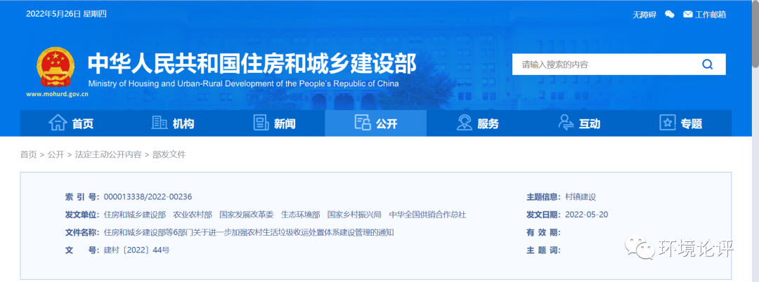 為深入貫徹黨中央、國(guó)務(wù)院關(guān)于實(shí)施鄉(xiāng)村建設(shè)行動(dòng)的決策部署,落實(shí)《農(nóng)村人居環(huán)境整治提升五年行動(dòng)方案(2021—2025年)》明確的目標(biāo)任務(wù),統(tǒng)籌縣鄉(xiāng)村三級(jí)生活垃圾收運(yùn)處置設(shè)施建設(shè)和服務(wù),進(jìn)一步擴(kuò)大農(nóng)村生活垃圾收運(yùn)處置體系覆蓋范圍,提升無(wú)害化處理水平,健全長(zhǎng)效管護(hù)機(jī)制,近日,住房和城鄉(xiāng)建設(shè)部等6部門(mén)印發(fā)《關(guān)于進(jìn)一步加強(qiáng)農(nóng)村生活垃圾收運(yùn)處置體系建設(shè)管理的通知》。