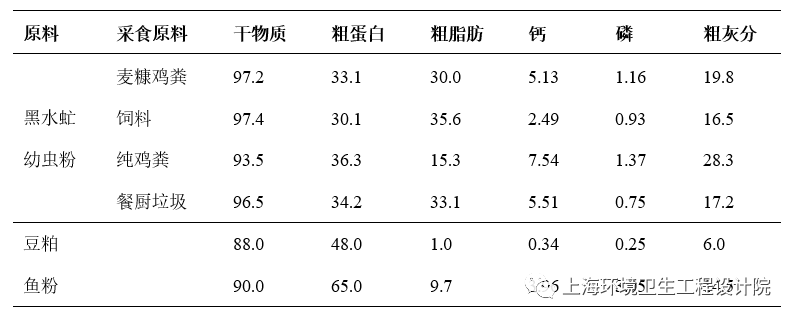 研究表明,黑水虻幼蟲的營養(yǎng)價(jià)值較高,營養(yǎng)組成具有一定的可塑性。分析表1數(shù)據(jù)可知,其體內(nèi)特定營養(yǎng)組分的含量高低可通過調(diào)節(jié)其采食的有機(jī)廢棄物的營養(yǎng)來實(shí)現(xiàn)。黑水虻烘干蟲粉中粗脂肪、鈣和灰分的含量受到采食底物的影響較大,而蛋白質(zhì)和氨基酸組成則相對(duì)比較穩(wěn)定。雖然幼蟲的氨基酸總含量低于黃粉蟲、蠅蛆、桑蠶蛹的氨基酸含量,但氨基酸如賴氨酸、蛋氨酸、亮氨酸、纈氨酸和酪氨酸含量較高,可通過優(yōu)化飼料配方增加飼料氨基酸含量,并不影響作為動(dòng)物飼料蛋白的品質(zhì)。表1 采食不同底物黑水虻與豆粕和魚粉的營養(yǎng)成分含量(%)比較
