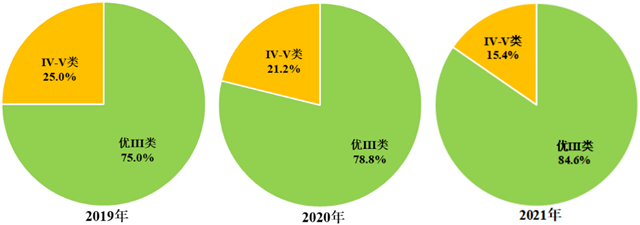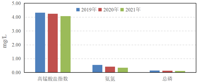 優(yōu)Ⅲ類水質(zhì)斷面比例逐年上升,2021年示范區(qū)優(yōu)Ⅲ類水質(zhì)斷面比例較2020年上升5.8個百分點,較2019年上升9.6個百分點;2021年氨氮和總磷平均濃度較2020年分別下降18.6%和6.3%,較2019年分別下降35.2%和14.4%;2019~2021年高錳酸鹽指數(shù)年均值基本持平。