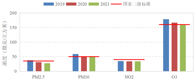 PM2.5、SO2、CO、O3評價指標逐年改善,2021年PM2.5、SO2、CO 、O3年均濃度較 2020 年分別下降 9.7%、14.3%、9.1%、4.8%,較2019年分別下降26.3%、25.0%、9.1%、11.2%。2021年PM10、NO2年均濃度與2020年持平,較2019年分別下降15.3%、2.9%。