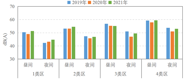 2021年,示范區(qū)各類聲環(huán)境功能區(qū)監(jiān)測均值均達到相應的聲環(huán)境質(zhì)量標準。2019~2021年示范區(qū)各類聲環(huán)境功能區(qū)監(jiān)測均值總體基本持平。