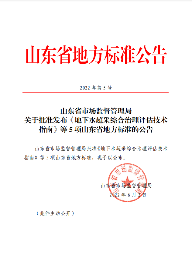 山東省市場監(jiān)督管理局關于批準發(fā)布《地下水超采綜合治理評估技術指南》等5項山東省地方標準的公告
