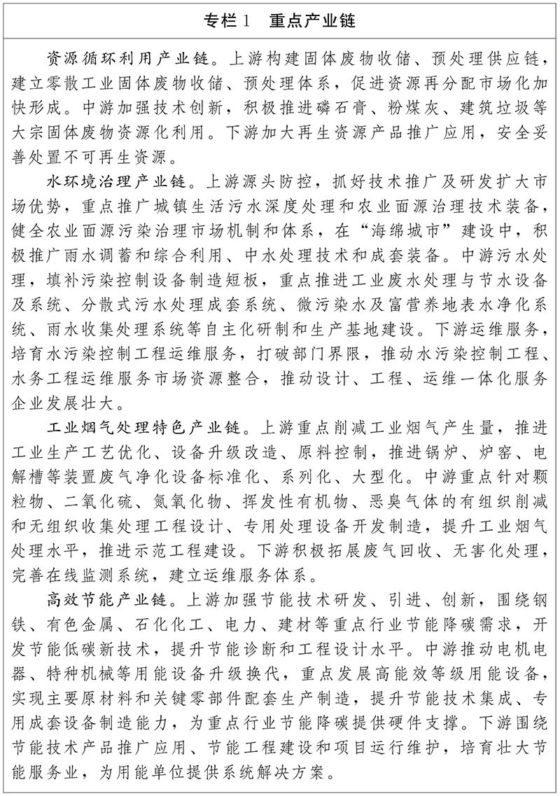 結(jié)合我省資源優(yōu)勢(shì)、市場(chǎng)優(yōu)勢(shì),立足現(xiàn)有產(chǎn)業(yè)基礎(chǔ),著眼未來產(chǎn)業(yè)發(fā)展,服務(wù)于綠色發(fā)展重大需求,發(fā)揮上游技術(shù)研發(fā)引領(lǐng)和資源供給優(yōu)勢(shì),提升中游節(jié)能環(huán)保技術(shù)裝備和技術(shù)服務(wù)競(jìng)爭(zhēng)力,保障下游技術(shù)應(yīng)用和市場(chǎng)服務(wù)質(zhì)量和水平,重點(diǎn)打造資源循環(huán)利用產(chǎn)業(yè)鏈、水環(huán)境治理產(chǎn)業(yè)鏈、工業(yè)煙氣處理特色產(chǎn)業(yè)鏈、高效節(jié)能產(chǎn)業(yè)鏈、綠色建筑建材產(chǎn)業(yè)鏈,做大做強(qiáng)優(yōu)勢(shì)環(huán)保產(chǎn)業(yè)。