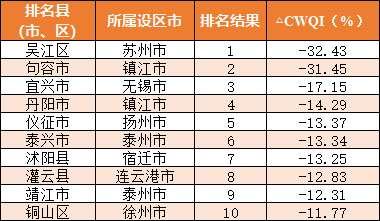 地表水環(huán)境質量改善幅度相對較快的前10位(1—10名)依次是:吳江區(qū)、句容市、宜興市、丹陽市、儀征市、泰興市、沭陽縣、灌云縣、靖江市、銅山區(qū);