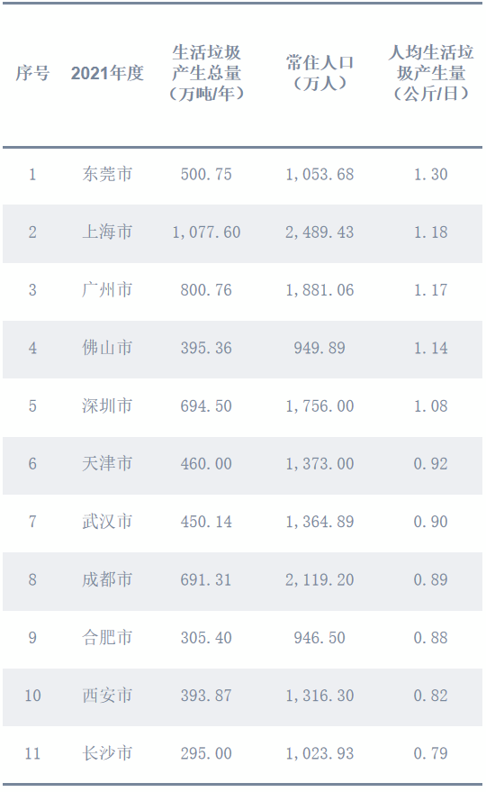2021年度,11個(gè)重點(diǎn)城市中,人均生活垃圾產(chǎn)生量最高的城市是東莞市,人均每日產(chǎn)生生活垃圾1.30公斤;人均生活垃圾產(chǎn)生量最低的城市是長沙市,人均每日產(chǎn)生生活垃圾0.79公斤。