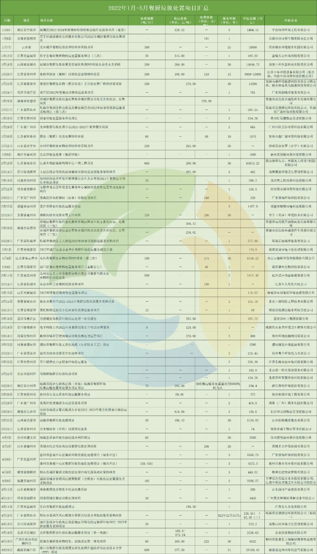 最新一則案例是,據財政部政府和社會資本合作中心消息,深圳市寶安區(qū)廚余垃圾收運處理PPP項目已經進入“采購階段”。該項目擬采用“壓榨預處理+漿化料處理”工藝、“相對分散、適度集中”的布局模式,建設(改造)1座寶城大型轉運站和10座分布式小型轉運站作為廚余垃圾壓榨處理改造站點,配套廚余垃圾分類收運系統(tǒng)。設計總規(guī)模為1550t/d,分兩批建設,其中第一批處理規(guī)模1250t/d;第二批處理規(guī)模300t/d,分流處理量不低于900t/d。這個項目的特殊之處在于,其總投資高達63,169.82萬元,合作期限16年。按照合作期內項目財政承受能力論證測算的財政支出責任計算,該項目需從預算中安排的支出責任匯總高達52.43億元(524384.64萬元)。也就是說,這個項目很有可能成為“史上最大的餐廚垃圾處理項目”!回顧歷史,2020年及2021年深圳寶安區(qū)城中村家庭廚余垃圾應急收運處理服務項目,都是由上海龍澄環(huán)境集團有限公司拿下,并且每次單價都高得驚人(2020年收運處理單價總金額為678.7元/噸;2021年為611.21元/噸)。該項目為一年一簽,總合同履行期限最長不超過3年,算起來也到了重新招標的時候。只是沒想到,這次寶安區(qū)直接扔出了一個“王炸”,以超52億元的超級大單炸翻了整個餐廚垃圾處理市場。這或許意味著,過去一直在生活垃圾中被作為配角的餐廚垃圾處理市場,終于迎來了真正的爆發(fā)期。(注:由于各地叫法不同,本文所稱“餐廚垃圾”涵蓋餐廚及廚余垃圾。)隨著我國雙碳政策的推動、垃圾分類工作的鋪開,以及城鎮(zhèn)化的快速發(fā)展,餐廚垃圾分出量大幅增長,后端產能配置逐漸成為“剛需”。近三年來,疫情影響使得全國的餐飲行業(yè)遭受重創(chuàng),但居民在家做飯產生的廚余垃圾產生量大增,餐飲垃圾的產生量不降反增。據估算,到2026年,我國整體餐廚垃圾的產生總量預計將達到1.81億噸?!笆奈濉蹦┢?,餐廚垃圾產生量將基本飽和。與之對應,餐廚垃圾處理設施“十四五”的投資空間則為700~1400億元,運營市場規(guī)模則有望在2025年達到150~250億元,年復合增長率達到30%以上。除了遠期目標,還可以看看近期的數(shù)據。據統(tǒng)計,2022年1月至5月,全國共開標71個餐廚垃圾項目,項目釋放量暴增3倍。要知道,2021全年一共才釋放出97個餐廚垃圾處理處置項目,2022年前5個月的項目釋放量就已經達到了去年的73%,旺盛的市場需求已成為現(xiàn)階段餐廚垃圾處置領域的真實寫照。為什么會是這樣?離不開政策的加持。從2010年開始,國家發(fā)改委正式批準全國33個城市作為首批餐廚垃圾處理試點單位,截至2019年,全國已設置了100個試點城市,可見政府對餐廚垃圾的重視程度。除試點外,政策法規(guī)及行業(yè)標準也在進一步完善。2021年7月《“十四五”循環(huán)經濟發(fā)展規(guī)劃》中明確提出,固廢處置行業(yè)要遵循“減量化、再利用、資源化”原則,著力建設資源循環(huán)型產業(yè)體系;《“十四五”城鎮(zhèn)生活垃圾分類和處理設施發(fā)展規(guī)劃》也指出,要鼓勵有序推進廚余垃圾處理設施建設,鼓勵積極探索廚余垃圾多元化可持續(xù)運營模式;同年5月由國家市場監(jiān)督管理總局、中國國家標準化管理委員會制定的國家標準《餐廚廢油資源回收和深加工技術要求》發(fā)布,于2021年12月1日起正式實施。▼2021年7月,國家發(fā)改委發(fā)布《“十四五”循環(huán)經濟發(fā)展規(guī)劃》這些政策與標準的出臺,為餐廚垃圾處理行業(yè)的發(fā)展完善了配套,指明了方向。地方層面,大連、北京、蘭州、上海、寧波等地已經明確出臺了餐廚垃圾收費標準,其他部分城市如淮安、石家莊、昆明、三明和西寧等城市也出臺了餐廚垃圾管理辦法,要求餐廚垃圾產生單位參考生活垃圾處理費進行增收,一張覆蓋全國的餐廚垃圾流向控制網絡正在密織鋪展。多重因素作用之下,近兩年來,餐廚垃圾處理項目因其政策補貼力度大、人力成本低、準入門檻低等原因,已成為不少環(huán)保企業(yè)的“救命稻草”和主攻方向。回到今年上半年的餐廚垃圾市場,其具體情況到底怎么樣?據統(tǒng)計,今年已釋放的71個餐廚垃圾項目中,僅有26個項目公布處理規(guī)模。按此計算,71個項目的合計處理規(guī)模大約為4092噸/日,預算投資額近23億元(2021年有54個項目公布處理規(guī)模,合計8257.5噸/日,平均單個項目為152.92噸/日)。整體來看,今年上半年的餐廚垃圾市場呈現(xiàn)出3個特點:在項目服務年限上,相比去年也更加穩(wěn)定。去年部分餐廚項目存在服務期限僅半年、120天、甚至100天的情況,今年則最低年限為1年。?2、項目平均單價降低