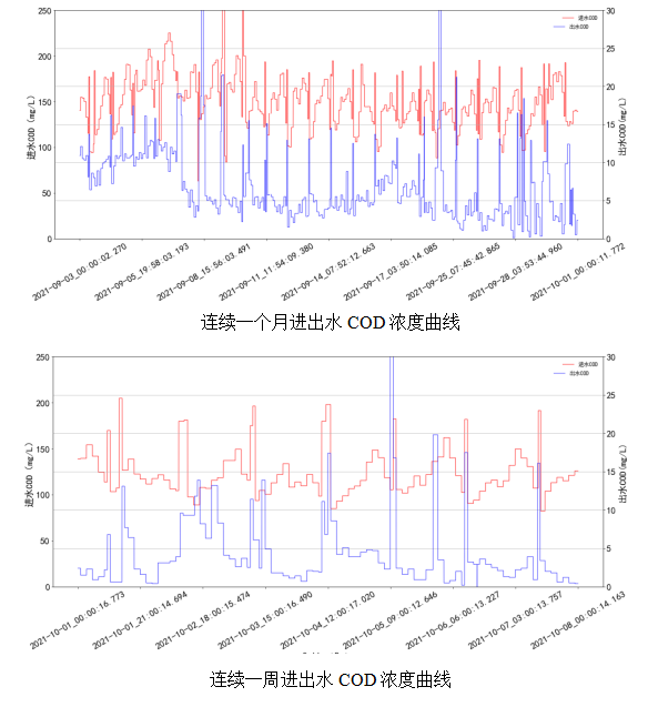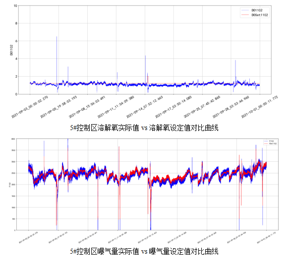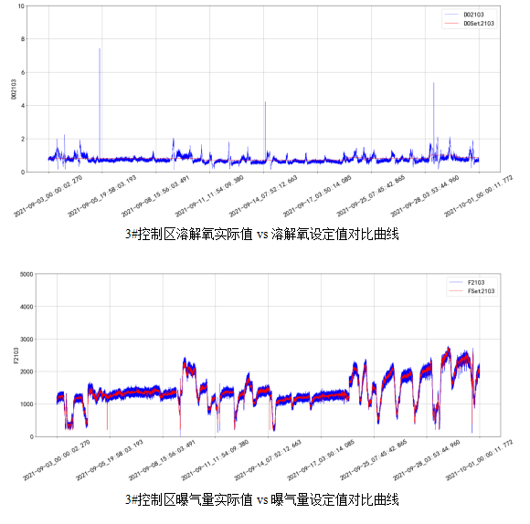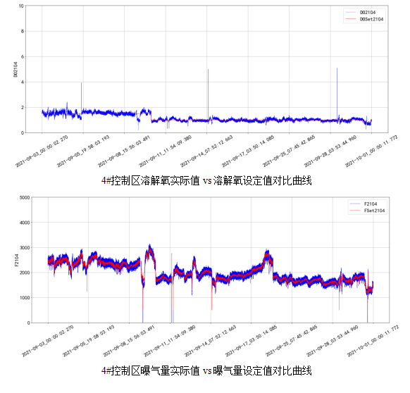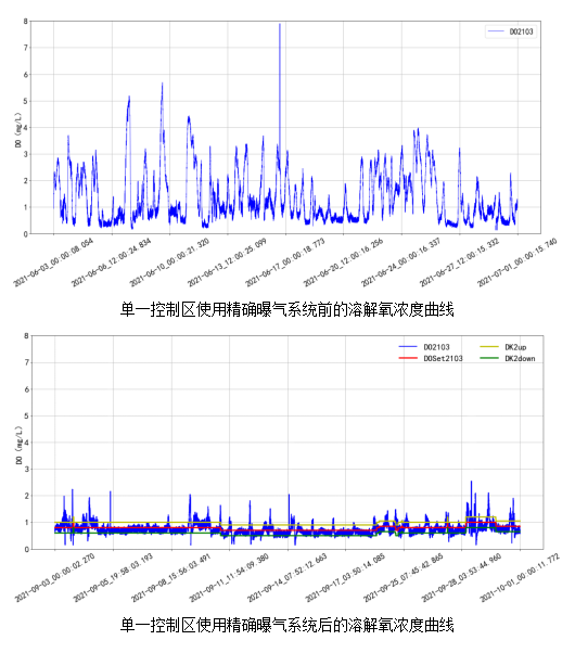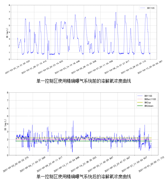 從圖中可看到,使用精確曝氣系統(tǒng)前的生化池溶解氧濃度波動較大,在使用精確曝氣系統(tǒng)后,溶解氧濃度控制平穩(wěn)。