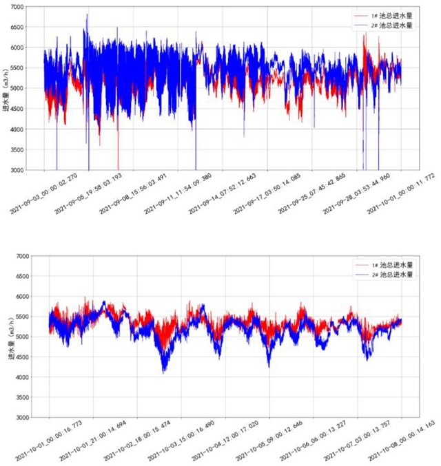 進水流量曲線如下,AVS精確曝氣系統(tǒng)運行期間兩座生化池進水流量在4500 m3/h至6000 m3/h范圍內(nèi)波動,對系統(tǒng)的穩(wěn)定運行帶來了一定的挑戰(zhàn)。