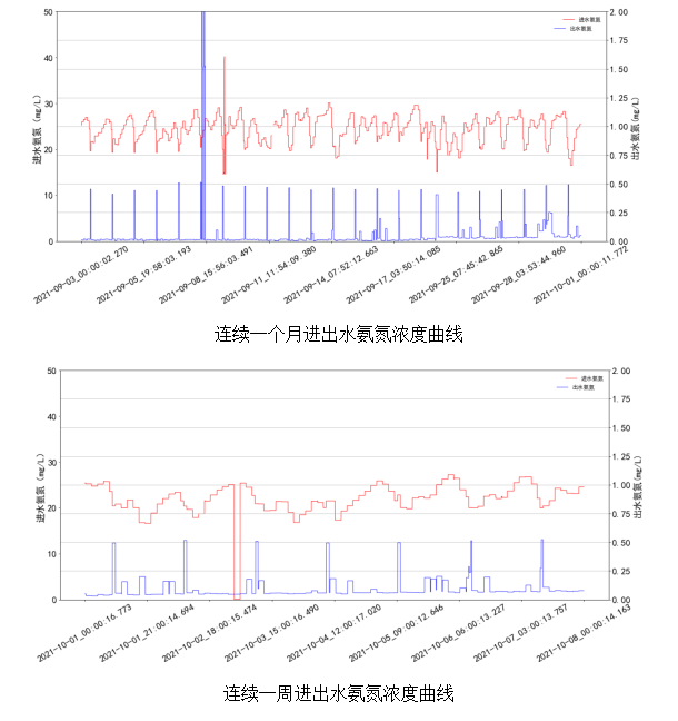 使用精確曝氣系統(tǒng)后,COD、氨氮、總氮等主要出水水質(zhì)指標控制達標,進出水COD、氨氮濃度曲線如下。由圖中數(shù)據(jù)可看出,AVS精確曝氣系統(tǒng)的運行,對于維持出水水質(zhì)的穩(wěn)定有很大的幫助。
