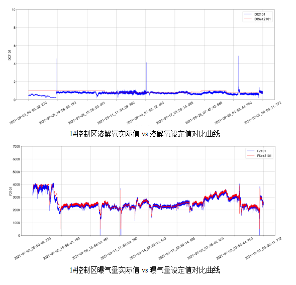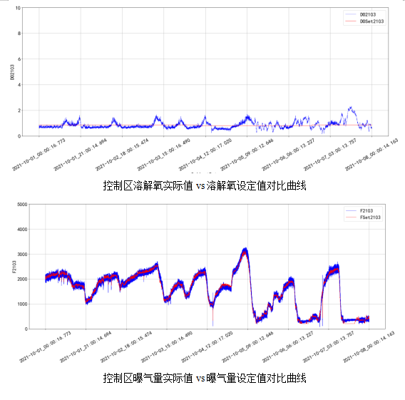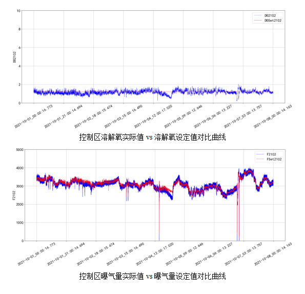 下圖為使用精確曝氣系統(tǒng)后連續(xù)一個月和連續(xù)一周的各溶解氧控制區(qū)溶解氧濃度與氣體流量控制曲線,通過溶解氧控制效果圖可看出,受控溶解氧能夠在設定目標值一定范圍內(nèi)波動,且設定值與實際值吻合度較好,反映不同溶解氧控制區(qū)的溶解氧濃度滿足控制要求。