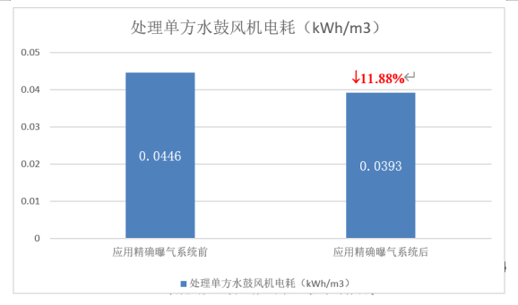 從上表可看出,使用精確曝氣系統(tǒng)前處理單方水鼓風機電耗為0.0446 kWh/m³,使用精確曝氣系統(tǒng)后處理單方水鼓風機電耗為0.0393 kWh/m³,實現(xiàn)了11.88%的鼓風機能耗節(jié)省。