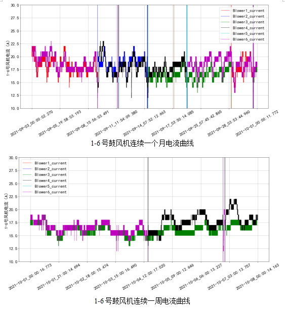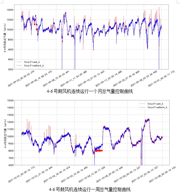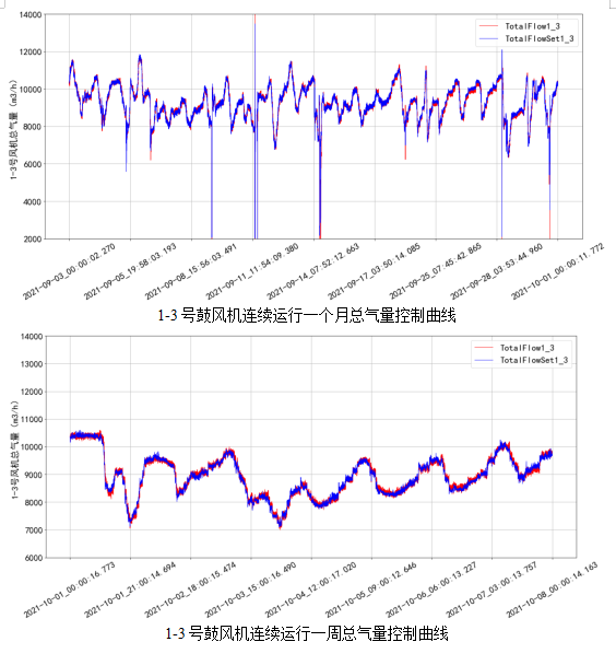 使用精確曝氣系統(tǒng)后連續(xù)一個月和連續(xù)一周的鼓風機控制曲線如下,由圖中曲線可看出,AVS精確曝氣系統(tǒng)能夠根據(jù)進水水量和水質(zhì)的變化,自動、實時的計算出生化系統(tǒng)所需曝氣量,并根據(jù)AVS系統(tǒng)計算得出的理論需氣量對鼓風機進行實時控制,實現(xiàn)了控制鼓風機啟停、運行負荷的變化,做到了生化系統(tǒng)的“按需供氣”。