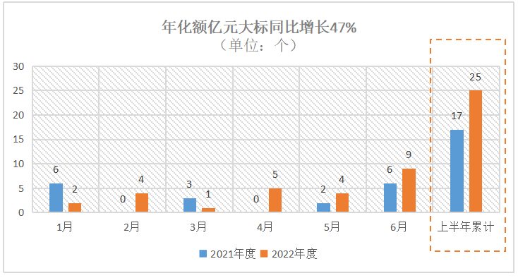 截止6月25日,2022年上半年累計開標年化額超億元環(huán)衛(wèi)大標總數(shù)達25個,同比增長47%。去年同期開標年化額超億元環(huán)衛(wèi)大標總數(shù)為17個。