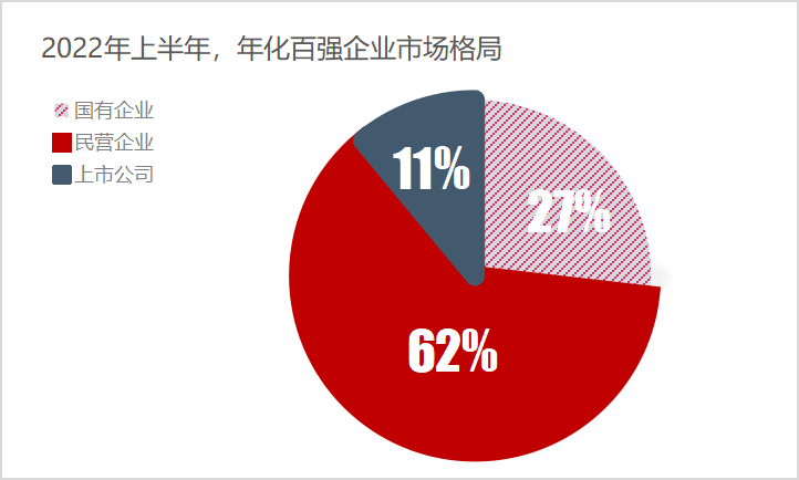 2022年1-5月份,年化額百強企業(yè)中(5個月度的年化百強企業(yè),總數(shù)為500家),國有企業(yè)134家,占比27%;民營企業(yè)311家,占比62%;上市公司55家,占比11%。