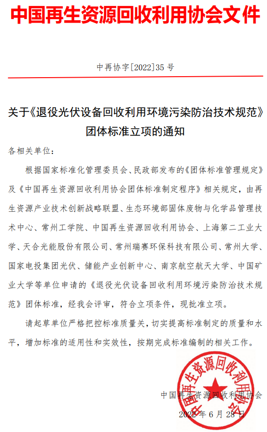 2022年6月28日,中國(guó)再生資源回收利用協(xié)會(huì)發(fā)布通知,明確《退役光伏設(shè)備回收利用環(huán)境污染防治技術(shù)規(guī)范》符合立項(xiàng)條件,批準(zhǔn)立項(xiàng)。中國(guó)再生資源回收利用協(xié)會(huì)要求起草單位嚴(yán)格把控標(biāo)準(zhǔn)質(zhì)量關(guān),切實(shí)提高標(biāo)準(zhǔn)制定的質(zhì)量和水平,增加標(biāo)準(zhǔn)的適用性和實(shí)效性,按期完成標(biāo)準(zhǔn)編制的相關(guān)工作。