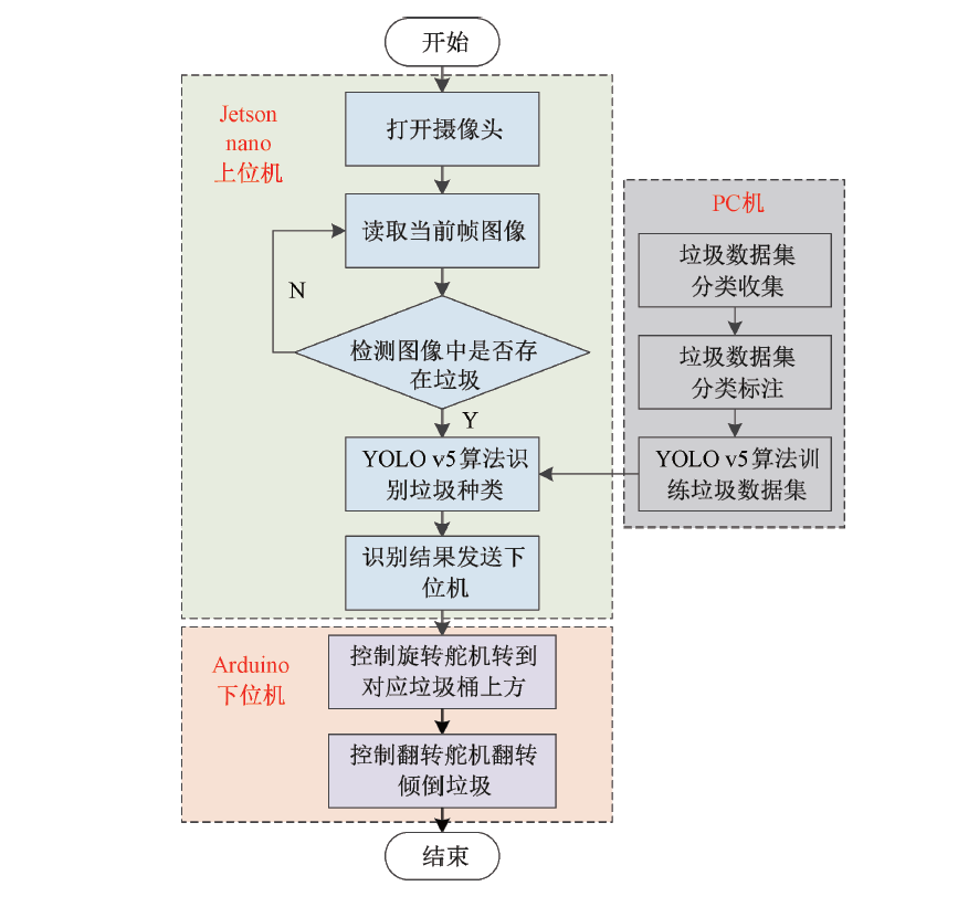 本設(shè)計(jì)不僅實(shí)現(xiàn)了垃圾識(shí)別軟件程序設(shè)計(jì),還在Jetson nano 平臺(tái)下實(shí)現(xiàn)了識(shí)別算法的嵌入式硬件化,同時(shí)配合機(jī)械結(jié)構(gòu)設(shè)計(jì),完成了實(shí)際應(yīng)用的自動(dòng)分類垃圾箱的設(shè)計(jì)。軟件部分采用最新深度學(xué)習(xí)算法模型YOLO v5進(jìn)行垃圾識(shí)別,識(shí)別結(jié)果通過串口通信發(fā)送至Arduino控制板中,由 Arduino控制板控制旋轉(zhuǎn)舵機(jī)的運(yùn)動(dòng)以及翻轉(zhuǎn)舵機(jī)運(yùn)動(dòng),從而實(shí)現(xiàn)垃圾自動(dòng)分類投放。