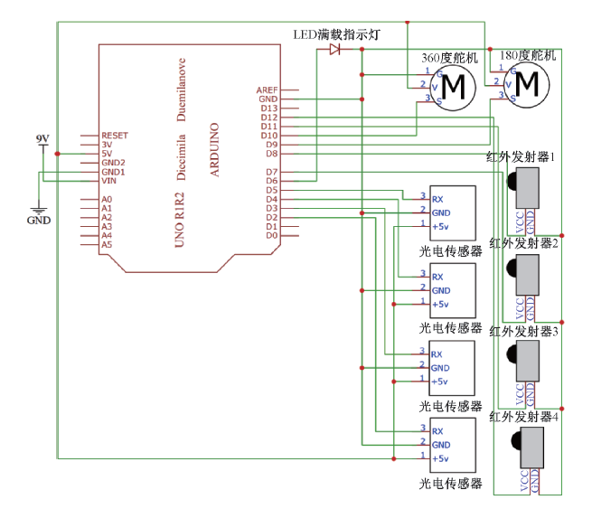 下位機(jī)硬件電路設(shè)計(jì)如圖4所示,Arduino 工作電壓一般為3~5 V,符合Led指示燈和4個(gè)紅外發(fā)射器的電壓要求,故可直接將該5個(gè)器件連接在引腳與CND之間,實(shí)現(xiàn)開關(guān)控制。LED正極連接Arduino 6號(hào)引腳,紅外發(fā)射器1、2、3、4的正極分別連接Arduino的 11、12、8、7號(hào)引腳。同理,2個(gè)舵機(jī)通過Arduino的+5V和 GND形成回路進(jìn)行供電。2個(gè)舵機(jī)均通過PWM信號(hào)控制,對(duì)應(yīng)Arduino 10號(hào)引腳和9號(hào)引腳,通過不同的占空比轉(zhuǎn)動(dòng)對(duì)應(yīng)的角度,實(shí)現(xiàn)了云臺(tái)及翻斗的精準(zhǔn)控制。4個(gè)光電傳感器供電原理同上,RX引腳分別連接Arduino 的5、4、3、2引腳,同時(shí)將Arduino 上的這4個(gè)引腳定義為輸入模式,實(shí)時(shí)檢測(cè)垃圾桶的裝載狀態(tài)。