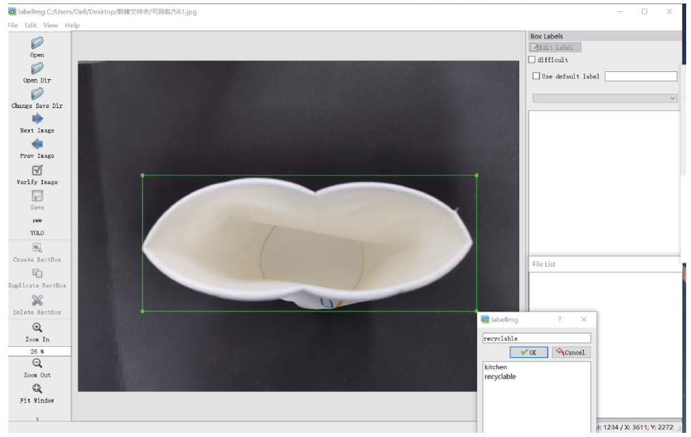 本設(shè)計(jì)以常見垃圾為例,尤其針對(duì)非住宅區(qū)的公共場(chǎng)所(如地鐵站﹑火車站、學(xué)校等場(chǎng)所)所產(chǎn)生的垃圾為例進(jìn)行算法研究,收集的常見垃圾數(shù)據(jù),包括食品包裝紙、礦泉水瓶、飲料瓶、易拉罐、塑料盒、電池、水果皮核、干果殼等。每一小類采集了約100張數(shù)據(jù),包括不同拍攝角度,不同腐壞程度等,共采集了4000張數(shù)據(jù),其中 3500張用于訓(xùn)練,500張用于測(cè)試。再將每小類劃分到廚余垃圾、可回收垃圾、有害垃圾以及其他垃圾中。部分不同垃圾的真實(shí)訓(xùn)練數(shù)據(jù)集如圖6所示。標(biāo)注工具采用LabelImg 軟件進(jìn)行標(biāo)注,標(biāo)注過程如圖7所示。