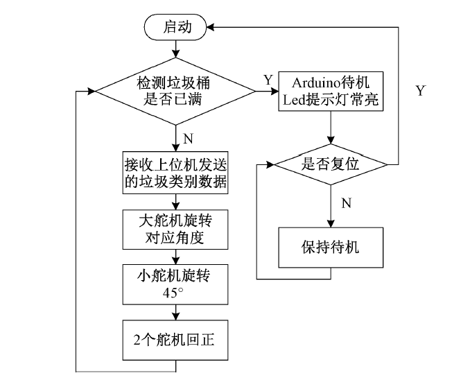 下位機(jī)軟件工作流程如圖5所示。首先啟動(dòng)Arduino,通過光電傳感器與紅外發(fā)射器模塊判斷垃圾桶是否已滿。若垃圾桶已滿,向上位機(jī)發(fā)送已滿信號(hào)、點(diǎn)亮Led燈同時(shí)進(jìn)入待機(jī)狀態(tài)。若垃圾桶未滿,則Arduino接收上位機(jī)信號(hào),信號(hào)0、1、2、3分別對(duì)應(yīng)廚余垃圾、可回收垃圾、有害垃圾、其他垃圾,Arduino與上位機(jī)Jetson Nano 之間的通信通過ASCII碼傳輸,對(duì)應(yīng)接收到的值為48、49、50、51 ,通過對(duì)這4個(gè)值的判斷,來控制舵機(jī)模塊準(zhǔn)確將垃圾投進(jìn)對(duì)應(yīng)的垃圾箱。大舵機(jī)對(duì)應(yīng)不同種類垃圾,0號(hào)垃圾桶逆時(shí)針旋轉(zhuǎn)45°,1號(hào)垃圾桶順時(shí)針旋轉(zhuǎn)45°,2號(hào)垃圾桶順時(shí)針旋轉(zhuǎn)135°,3號(hào)垃圾桶逆時(shí)針旋轉(zhuǎn)135°,從而將云臺(tái)對(duì)準(zhǔn)相應(yīng)的垃圾桶,之后小舵機(jī)旋轉(zhuǎn)30°將翻斗抬起,將垃圾準(zhǔn)確迅速地投入垃圾桶。2個(gè)動(dòng)作完成后,2個(gè)舵機(jī)分別回到初始0°狀態(tài)。投放完畢后﹐翻斗、云臺(tái)分別回正,同時(shí)檢測(cè)垃圾桶是否已滿,并重復(fù)上述步驟。