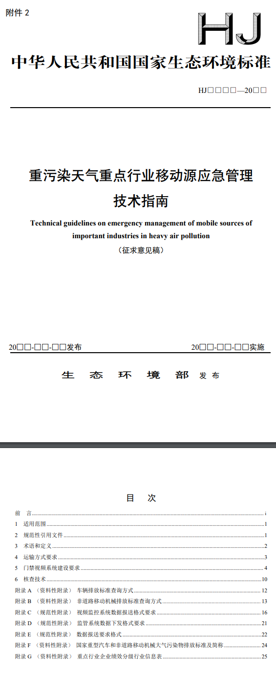 《重污染天氣重點(diǎn)行業(yè)移動(dòng)源應(yīng)急管理技術(shù)指南(征求意見稿)》規(guī)定了重污染天氣重點(diǎn)行業(yè)移動(dòng)源運(yùn)輸方式、門禁視頻系統(tǒng)建設(shè)、核查技術(shù)及數(shù)據(jù)報(bào)送要求,由由生態(tài)環(huán)境部大氣環(huán)境司、法規(guī)與標(biāo)準(zhǔn)司組織制訂。