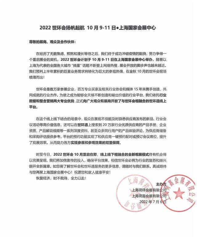 在經(jīng)歷了無數(shù)焦慮,煎熬和漫長等待之后,我們終于成功沖破疫情的阻撓,努力爭得一個重啟展會的契機,2022世環(huán)會計劃于10月9-11日在上海國家會展中心舉辦。隨著以上海為代表的全國各大城市“摘星”話題不斷登上網(wǎng)絡(luò)熱搜,展會開放的腳步聲也越來越近。我們預(yù)判上半年累積的巨量業(yè)務(wù)需求將轉(zhuǎn)化為巨大的參觀熱情,在金秋10月的世環(huán)會現(xiàn)場噴薄而出!