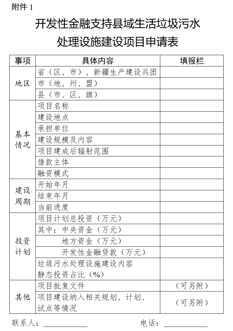 住房和城鄉(xiāng)建設(shè)部村鎮(zhèn)建設(shè)司胡建坤 010—58934706,58933123(傳)黃 瓊 010—68306870,88308848(傳)1.開發(fā)性金融支持縣域生活垃圾污水處理設(shè)施建設(shè)項(xiàng)目申請表2.開發(fā)性金融支持縣域生活垃圾污水處理設(shè)施建設(shè)項(xiàng)目進(jìn)展表