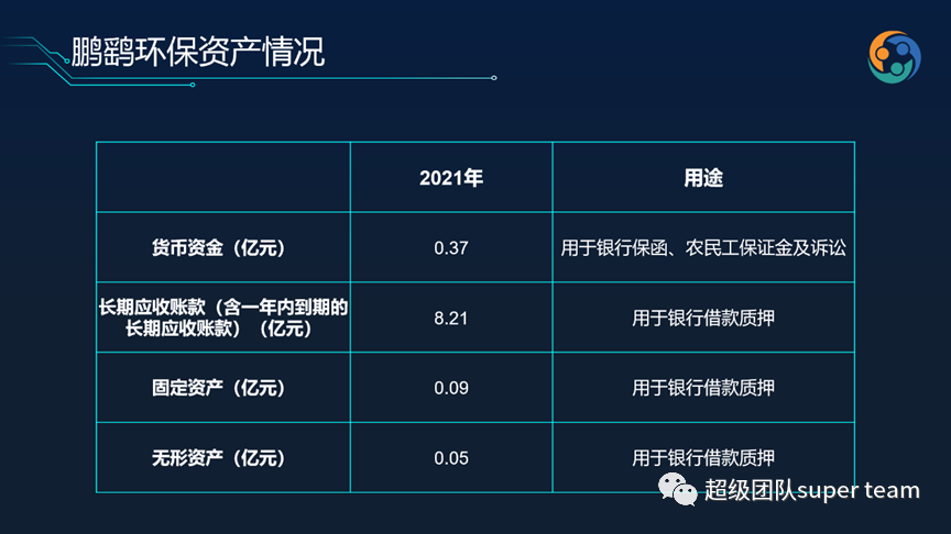 截至2021年底,鵬鷂環(huán)保貨幣現(xiàn)金有4.47億,但短期借款有6.77億,長期借款有7.18億,還有一年內(nèi)到期的長期借款有1.2億,貨幣現(xiàn)金只能覆蓋短期還款。鵬鷂環(huán)保多個資產(chǎn)科目還存在抵押或質(zhì)押的情況,受限資產(chǎn)金額約15億,占總資產(chǎn)比例約1/2。