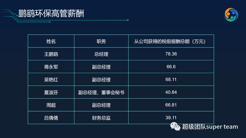 鵬鷂環(huán)保一直強(qiáng)調(diào)的是以人為本, 從鵬鷂環(huán)保的高管薪酬來看,如果鵬鷂把自己定義為一個區(qū)域型企業(yè),鵬鷂的高管薪酬絕對不算低,絕對給出了對高管人才的重視。而且這僅為上市公司公開數(shù)據(jù)。