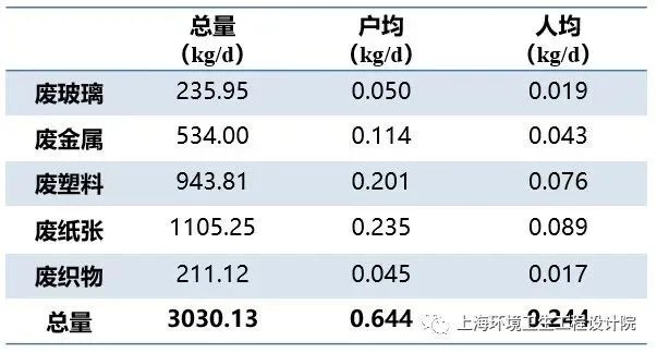本次調(diào)研有效樣本為168戶(hù)家庭。調(diào)研周期內(nèi)共收集可回收物3030.13千克,戶(hù)均0.644千克/日,人均0.244千克/日。根據(jù)以上數(shù)據(jù)測(cè)算,按2487.0萬(wàn)常住人口計(jì)算(2021年統(tǒng)計(jì)數(shù)據(jù)),上海居民家庭產(chǎn)生可回收物總量為6068.28噸/日。