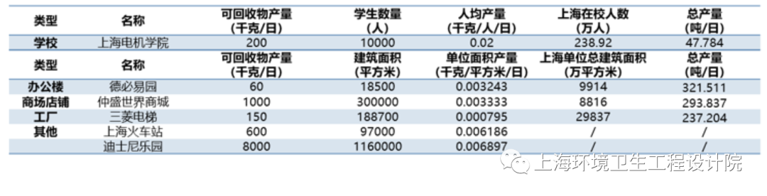 為了解不同類(lèi)型單位可回收物產(chǎn)量,2020年6月-9月本研究團(tuán)隊(duì)開(kāi)展了學(xué)校、辦公樓、商場(chǎng)店鋪、工廠(chǎng)、交通樞紐、游樂(lè)園等6個(gè)典型企事業(yè)單位可回收物產(chǎn)量調(diào)研。
