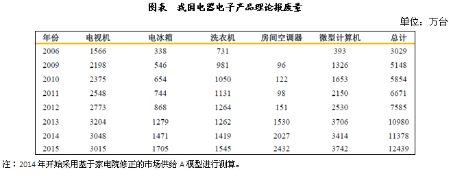 據(jù)了解,截止到2015年底,進(jìn)入廢棄電器電子產(chǎn)品處理基金補(bǔ)貼名單的處理企業(yè)年處理能力超過(guò)1.5億臺(tái),實(shí)際處理廢棄電器電子產(chǎn)品達(dá)到7500萬(wàn)臺(tái)左右。
