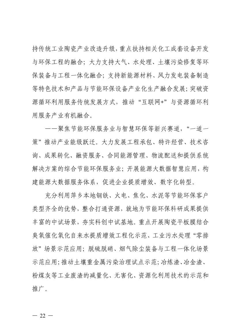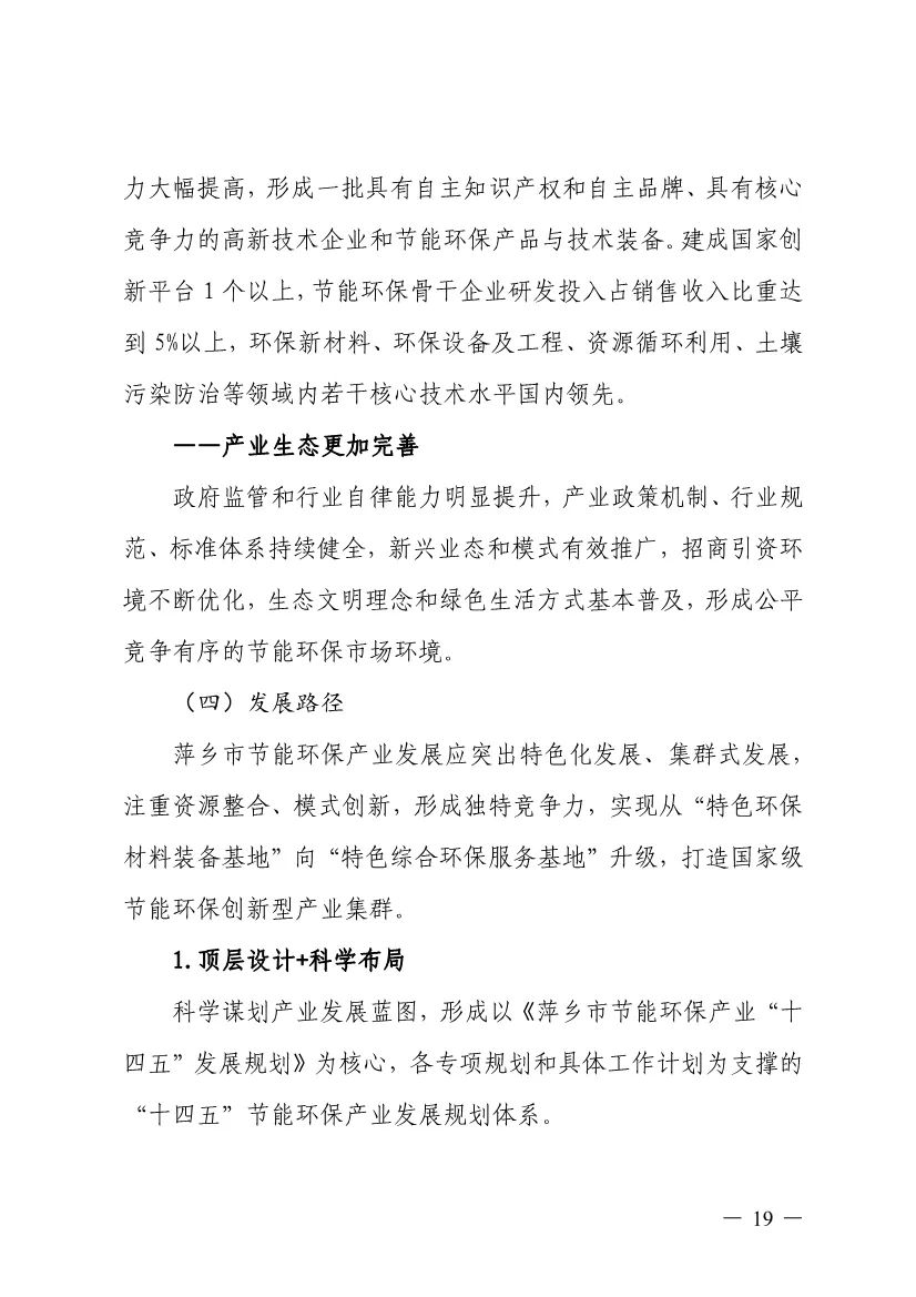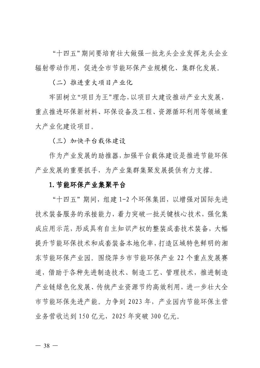 “十四五”期間,組建1-2個(gè)環(huán)保集團(tuán),以增強(qiáng)對(duì)國(guó)際先進(jìn)技術(shù)裝備服務(wù)的承接能力,著力突破一批關(guān)鍵核心技術(shù),強(qiáng)化集成應(yīng)用示范,形成具有自主知識(shí)產(chǎn)權(quán)的整裝成套技術(shù)裝備,大幅提升節(jié)能環(huán)保技術(shù)和成套裝備本地化率,打造區(qū)域特色鮮明的湘東節(jié)能環(huán)保產(chǎn)業(yè)園。