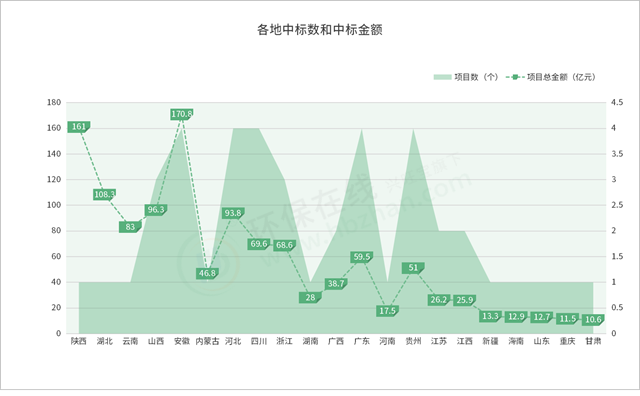 擴(kuò)展到全部中標(biāo)項(xiàng)目的熱力分布圖,安徽、河北、四川、廣東、貴州等釋放體量較大,尤其是安徽,數(shù)量多,投資金額也大。陜西雖然只有一個(gè)項(xiàng)目,但是其金額達(dá)到了161億,單體數(shù)額最高,湖北一個(gè)項(xiàng)目也有108.3億。