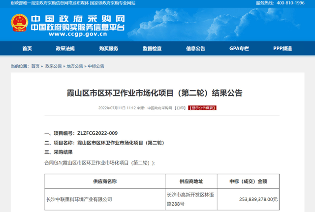 經(jīng)歷了去年的短暫下滑之后,盈峰環(huán)境在2022年上半年迎來爆發(fā)。7月11日,中國政府采購網(wǎng)發(fā)布廣東省湛江市霞山區(qū)市區(qū)環(huán)衛(wèi)作業(yè)市場化項目(第二輪)結(jié)果公告,長沙中聯(lián)重科環(huán)境產(chǎn)業(yè)有限公司中標(biāo),中標(biāo)金額2.53839378億元,項目服務(wù)期為3年。