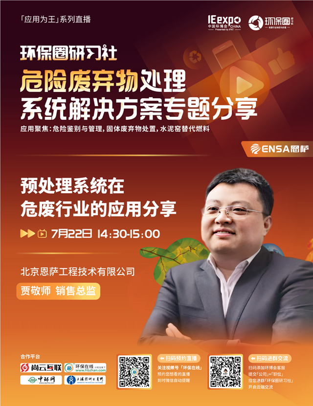 7月22日(星期五)下午14:00-15:30,環(huán)保圈研習(xí)社“應(yīng)用為王”系列直播,危險(xiǎn)廢棄物處理系統(tǒng)解決方案專(zhuān)題分享,我們有幸邀請(qǐng)到了上海化工院、北京恩薩、潤(rùn)天環(huán)保3家企業(yè)的技術(shù)專(zhuān)家做客直播間,與我們共同探討危險(xiǎn)廢棄物的鑒別與管理,危廢焚燒預(yù)處理,水泥窯協(xié)同處置等技術(shù)及相關(guān)解決方案。