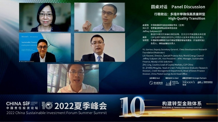 第二輪圓桌對話環(huán)節(jié)圍繞“多措并舉確保高質(zhì)量轉(zhuǎn)型”展開,由中國發(fā)展研究基金會副秘書長俞建拖主持。世界能源理事會亞洲項(xiàng)目總監(jiān)劉小衛(wèi),穆迪ESG解決方案事業(yè)部副總裁、亞太區(qū)可持續(xù)金融業(yè)務(wù)經(jīng)理Jeffrey Sukjoon LEE,CDP全球環(huán)境信息研究中心中國辦公室資本市場業(yè)務(wù)負(fù)責(zé)人朱聆,中國郵政儲蓄銀行總行授信管理部授信政策處(行業(yè)研究處)負(fù)責(zé)人與綠色金融處負(fù)責(zé)人張明哲博士就高質(zhì)量轉(zhuǎn)型背景下,可持續(xù)金融存在的短板及其原因、以及潛在的解決方案展開了熱烈討論。Jeffrey指出,轉(zhuǎn)型金融對推動亞太地區(qū)的可持續(xù)發(fā)展至關(guān)重要。如果所在行業(yè)減排難度大的發(fā)行人希望進(jìn)入可持續(xù)金融市場獲得可持續(xù)融資,他們就需要可信的轉(zhuǎn)型計(jì)劃、戰(zhàn)略和指標(biāo)。雖然我們看到企業(yè)在溫室氣體排放的信息披露方面取得了進(jìn)步,但在標(biāo)準(zhǔn)化和覆蓋范圍方面仍有很多工作要做。