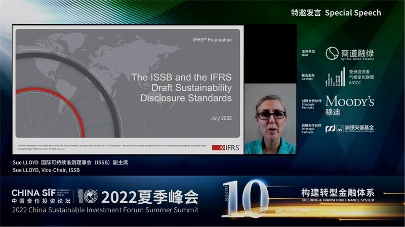 隨后,國際可持續(xù)準(zhǔn)則理事會(ISSB)副主席Sue LLOYD做了特邀發(fā)言。她介紹,ISSB由國際財(cái)務(wù)報(bào)告準(zhǔn)則(IFRS)基金會在2021年第26屆聯(lián)合國氣候變化大會上發(fā)起,旨在制定統(tǒng)一的可持續(xù)發(fā)展報(bào)告準(zhǔn)則。她分享了ISSB近期發(fā)布的兩份可持續(xù)披露準(zhǔn)則文件征求意見稿的主要內(nèi)容,即《國際財(cái)務(wù)報(bào)告可持續(xù)披露準(zhǔn)則第1號——可持續(xù)相關(guān)財(cái)務(wù)信息披露一般要求(征求意見稿)》和《國際財(cái)務(wù)報(bào)告可持續(xù)披露準(zhǔn)則第2號——氣候相關(guān)披露(征求意見稿)》,并呼吁大家在七月底之前積極提供反饋。