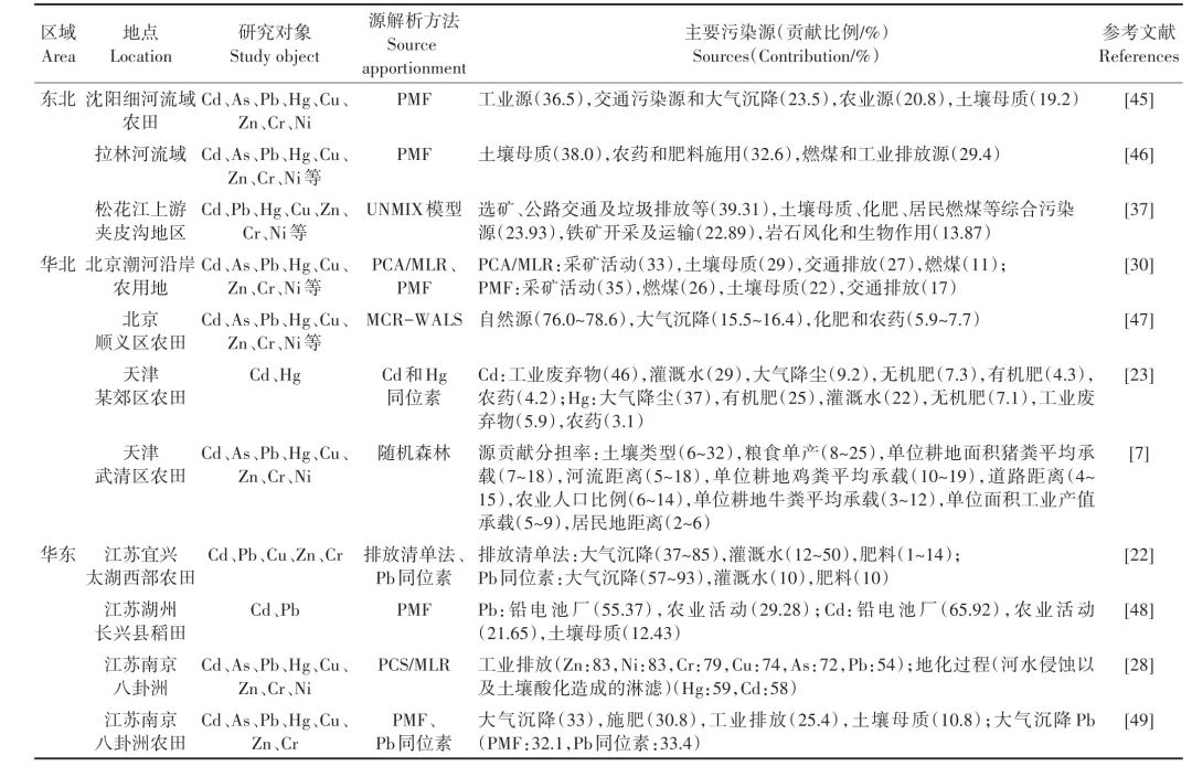 關(guān)于華北地區(qū)土壤重金屬源解析的近期文章共發(fā)現(xiàn)了13篇,涉及北京、天津、河北、山西和內(nèi)蒙古地區(qū)的2831個表層土壤樣品,所采用的定性源解析方法主要為PCA、相關(guān)性分析、空間分析等,定量源解析方法有PMF、PCA-MLR、同位素比值法等(表3)??傮w上,華北地區(qū)農(nóng)田土壤中的主要污染重金屬元素是Cd,其次有Cu、Hg、Zn、Pb等。該地區(qū)農(nóng)田土壤中的As、Cr、Ni主要受土壤母質(zhì)的控制,個別地方的As還有采礦活動和大氣沉降的貢獻(xiàn);除此以外,其余重金屬元素都受到一定程度的外源污染。Cd、Cu和Zn的污染來源仍以農(nóng)業(yè)活動(肥料、農(nóng)藥、灌溉水)為主,部分地區(qū)Cd還受到工業(yè)活動的影響。對于Pb的來源,土壤母質(zhì)、采礦活動、大氣沉降、污水灌溉等都有一定程度的貢獻(xiàn)。Hg主要受大氣沉降和灌溉水控制,局部地區(qū)有工業(yè)活動的影響。對于工業(yè)區(qū)周邊的非農(nóng)田土壤來說,重金屬的累積明顯與工業(yè)活動、燃煤、交通排放緊密相關(guān)。