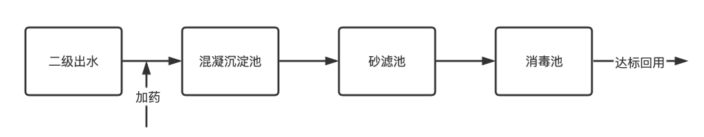 污水廠二級出水通過投加絮凝劑,經(jīng)混凝、絮凝后,水體中剩余微小顆粒和膠態(tài)物質(zhì)凝聚成較大絮凝體,繼而在沉淀池進行沉淀,再通過濾池的過濾作用得以去除。過濾后的水被送入消毒池,用臭氧或氯等消毒,殺滅細菌和病毒,然后將達標的處理水送入中水道回用。