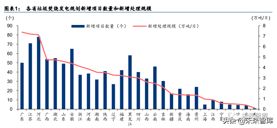 2017 年 12 月 12 日,國家發(fā)改委聯(lián)合五部委下發(fā)《關(guān)于進(jìn)一步做好生活垃圾焚燒發(fā)電廠規(guī) 劃選址工作的通知》,要求各?。▍^(qū)、市)應(yīng)編制本地區(qū)省級生活垃圾焚燒發(fā)電中長期專項(xiàng) 規(guī)劃。截至 2022 年 5 月底,全國已有 21 個(gè)省(區(qū)、市)發(fā)布中長期專項(xiàng)規(guī)劃及修訂稿, 13 個(gè)?。▍^(qū)、市)相繼發(fā)布涉及生活垃圾焚燒發(fā)電的“十四五”規(guī)劃,整理后得到 29 個(gè) ?。▍^(qū)、市)規(guī)劃新增項(xiàng)目數(shù)量合計(jì) 974 個(gè),新增處理規(guī)模合計(jì) 84.3 萬噸/日。其中,規(guī)劃 新增項(xiàng)目數(shù)量前三的?。▍^(qū)、市)為河北、江蘇和安徽,分別為 78/71/65 個(gè),規(guī)劃新增處 理規(guī)模前三的?。▍^(qū)、市)為廣東、江蘇和河北,分別為 7.4/7.2/7.1 萬噸/日。