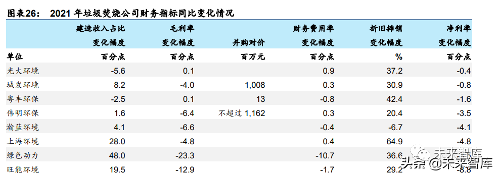財(cái)務(wù)費(fèi)用和折舊攤銷影響下,產(chǎn)能增長有望穩(wěn)定盈利水平。2021 年偉明環(huán)保和城發(fā)環(huán)境均 實(shí)施了較大規(guī)模的并購,并購交易對價(jià)分別為不超過 11.62/10.08 億元,其財(cái)務(wù)費(fèi)用率同比 均有小幅提升,我們認(rèn)為,并購在短期會(huì)帶來財(cái)務(wù)費(fèi)用增長,但投運(yùn)產(chǎn)能的不斷增加將提 供穩(wěn)健現(xiàn)金流,改善公司財(cái)務(wù)結(jié)構(gòu),有望消除財(cái)務(wù)費(fèi)用增加的短期影響。綠色動(dòng)力由于首 次確認(rèn)建造收入和固廢業(yè)務(wù)增長,2021 年?duì)I業(yè)收入同比+122%,因此財(cái)務(wù)費(fèi)用率下降 10.7pp。新增投運(yùn)產(chǎn)能帶來折舊攤銷上漲,項(xiàng)目投運(yùn)初期產(chǎn)能利用率較低,盈利能力相對 較低,我們認(rèn)為,投運(yùn)項(xiàng)目產(chǎn)能度過爬坡期之后,盈利能力可達(dá)到穩(wěn)定狀態(tài)。