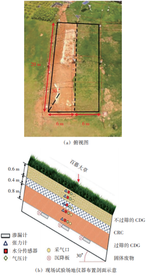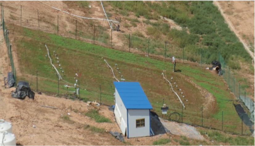 香港科技大學(xué)吳宏偉教授團(tuán)隊于2016 年在深圳下坪生活垃圾填埋場二期西段建設(shè)了全天候3層覆蓋層試驗區(qū),如圖9所示,其中一半覆蓋層試驗區(qū)種植百慕大草,另一半作為參照組,坡面不種植任何植物,并由無紡?fù)凉げ几采w,以防止降雨期間地表侵蝕。該覆蓋層坡度為30°,經(jīng)受深圳數(shù)次強(qiáng)臺風(fēng)暴雨依然穩(wěn)定,有效提升了填埋場庫容。為驗證3層土質(zhì)覆蓋層的防滲性能,對覆蓋層試驗場進(jìn)行了長達(dá)54個月的監(jiān)測,包括降雨量、覆蓋層滲漏量、孔隙水壓力及含水量變化等?,F(xiàn)場監(jiān)測數(shù)據(jù)表明,無膜的全天候3層覆蓋層在濕潤區(qū)年均滲漏量低于北美濕潤區(qū)覆蓋層設(shè)計標(biāo)準(zhǔn)。
