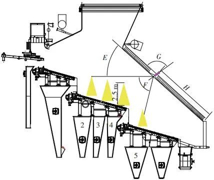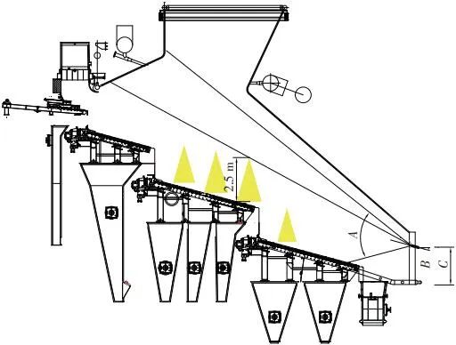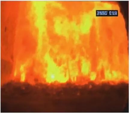 當(dāng)前生活垃圾焚燒爐廣泛采用的爐膛火焰監(jiān)視系統(tǒng)基本上都是由早期應(yīng)用在水泥廠、鋼鐵廠的加熱爐、退火爐和氧化鋁廠等行業(yè)內(nèi)的高溫看火工業(yè)電視演變升級而來。內(nèi)窺式數(shù)字高清爐膛火焰監(jiān)視系統(tǒng)成像裝置主要由耐高溫針孔電動鏡頭、寶石物鏡、光學(xué)濾光片、光圈焦距調(diào)節(jié)器等組成,配有電控推進器、氣源控制柜、光端機等輔助設(shè)備。其核心問題是如何在生活垃圾焚燒爐的高溫、多塵、強腐蝕環(huán)境中長周期穩(wěn)定運行,保證火焰畫面不丟包、不失真。1)優(yōu)勢特性分析。一是技術(shù)成熟、運行穩(wěn)定。隨著我國近一二十年間生活垃圾發(fā)電廠的興建,爐膛火焰監(jiān)視系統(tǒng)的技術(shù)也處于不停地優(yōu)化和迭代之中,目前已能滿足穩(wěn)定、可靠的要求。其中常規(guī)配置參數(shù)為攝像頭300 萬像素,響應(yīng)時間2 s,光圈(F數(shù))1.6,焦距2.4 mm。二是工作環(huán)境好。爐膛火焰監(jiān)視器探頭通常安裝于焚燒爐后墻,所處位置是垃圾燃燒最末端,常規(guī)工況下探頭周圍煙氣溫度通常<600 ℃。較之焚燒爐其他高溫環(huán)境已算“宜居地帶”。三是維護量小。焚燒爐后墻幾乎沒有結(jié)焦現(xiàn)象,常規(guī)爐膛火焰監(jiān)視探頭開孔位置僅存有因爐膛偶爾正壓時煙氣外冒造成的積灰,積灰量不大,清理工作較為輕松。2)劣勢特性分析。一是參數(shù)單一。因垃圾焚燒行業(yè)爐型構(gòu)造和燃燒成分的特殊性,垃圾焚燒爐長期采用的火焰探頭利用的是光學(xué)成像原理,運行人員僅能通過觀察火焰形狀和位置來判斷焚燒爐工況,無法得到多維度參數(shù)。二是視角局限。爐膛火焰探頭通常位于焚燒爐后墻,安裝角度朝向爐內(nèi)成斜向上方向,與水平線夾角15°左右,探頭視場角通常>60°。以某大型列動順推爐排焚燒爐為例,在此仰視角度下可以看到爐排燃燒段尾部、燃燼段前部兩面明顯的火焰幕墻,由于火焰鋒面遮擋,很難觀察到燃燒段中前部的火焰狀況。 以某單臺750 t/d大型列動順推爐排焚燒爐中爐膛火焰監(jiān)視器安裝位置和顯示畫面為實例,具體分析火焰成像狀態(tài)。其實際火焰成像畫面見圖1。成像角度是由焚燒爐后墻探頭位置向上仰視爐膛。因焚燒工況十分良好,靠近后墻的燃燼段區(qū)域幾乎沒有明火,燃燒段尾部成一面豎直、光亮的黃紅色火焰鋒面,高度約為2.5 m。對應(yīng)的爐膛火焰監(jiān)視器安裝示意如圖2所示。爐膛火焰探頭安裝在焚燒爐后墻,安裝位置與后墻觀火平臺地面距離為C(m)。開孔傾角與水平方向夾角為B(°),有效視場角為A(°)。圖2中由黃色填充的三角形區(qū)域代表正常燃燒火焰,其中標注高度2.5 m的區(qū)域為燃燒爐排尾部火焰,即為圖1所顯示的火焰鋒面。顯然,從爐膛火焰監(jiān)視器向上望去,燃燒段前部、中部火焰為視野盲區(qū)。由于被燃燒段尾部火焰鋒面遮擋,通過火焰監(jiān)視器通常只能看到燃燒段尾部、燃燼段前部這兩個區(qū)域的火焰。