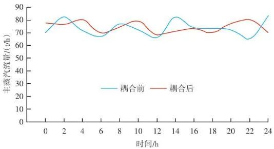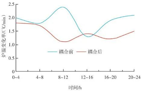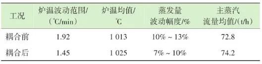 如圖9所示,X區(qū)域?qū)崟r反饋溫度經(jīng)過低切保護模塊LCUT和濾波模塊LAG后,與預(yù)設(shè)值M進行比較,計算的差值進入溫度-風(fēng)量折算函數(shù)F(x)。同時根據(jù)溫度上升和下降的速度變化率K,對函數(shù)的輸出速率進行擾動,改變其響應(yīng)速度。首先X區(qū)域的理論計算風(fēng)量是耦合前原有ACC系統(tǒng)通過垃圾熱值、垃圾占比、鍋爐蒸發(fā)量、氧氣含量、鍋爐焓值等一系列參數(shù)計算出來的爐排下一次風(fēng)支管風(fēng)量,是實時變化的動態(tài)數(shù)值,而X區(qū)域的溫度預(yù)設(shè)值M與反饋值P的差值反映的是X區(qū)域內(nèi)垃圾焚燒過于劇烈,還是處于未完全燃燒狀態(tài)。因為垃圾焚燒過程的復(fù)雜性,可以做出以下關(guān)系函數(shù):一方面在爐內(nèi)垃圾層厚度等于或大于理論的標準厚度前提下,當(dāng)X區(qū)域溫度M大于P則風(fēng)量減少,當(dāng)X區(qū)域溫度M小于P則風(fēng)量增加,當(dāng)X區(qū)域溫度M等于P則保持原有ACC計算風(fēng)量不變,此時選擇公式F1(x)內(nèi)部函數(shù);另一方面在爐內(nèi)垃圾層厚度小于標準厚度前提下,此時判斷料層過薄,風(fēng)量太大容易出現(xiàn)燒空、燒斷料的情況,因此當(dāng)M與P的差值為正數(shù)或負數(shù)時都會適當(dāng)減少風(fēng)量,但根據(jù)溫度的高或低對應(yīng)減少風(fēng)量的幅度會不同,此時利用F2(x)內(nèi)部函數(shù)。12個溫度劃分區(qū)域都基于此耦合邏輯,具體設(shè)定參數(shù)適時調(diào)整。通過干擾獨立配風(fēng)的風(fēng)量,達到改變整個焚燒爐一次風(fēng)風(fēng)量的效果。生活垃圾焚燒爐的排放物在滿足GB 18485—2014 生活垃圾焚燒污染控制標準的前提下,為保障焚燒爐的長期安全運行、汽機系統(tǒng)的穩(wěn)定高效運轉(zhuǎn),通常通過爐溫和主蒸汽流量這兩個因素來判斷鍋爐運行是否良好。以下工況為某項目單臺750 t/d生活垃圾焚燒爐在紅外熱成像管理系統(tǒng)應(yīng)用前、應(yīng)用后兩段時期的實際運行參數(shù),以此實例來解析該系統(tǒng)的運行效果。該項目額定主蒸汽流量為74 t/h。如圖10所示,藍色實線為耦合前24 h變化率波動范圍,紅色實線為耦合后24 h變化率波動范圍。爐溫變化率指的是焚燒爐上、中、下3層共計9個溫度測點的熱電偶反饋溫度在每分鐘內(nèi)升高或降低的溫度值,而溫度變化率波動范圍指的是單位時間內(nèi)溫度變化率最高值與最低值之間的溫度差,該差值越大表明爐溫波動越大,即工況越不穩(wěn)定,波動范圍越小表明工況越平穩(wěn)。此期間溫度也一直未低于環(huán)保部要求的最低限(850 ℃/2 s),均介于950~1 050 ℃。焚燒爐主蒸汽流量曲線如圖11所示,左側(cè)縱坐標為主蒸汽流量,額定蒸發(fā)量74 t/h。圖中藍色實線為紅外熱成像系統(tǒng)與ACC系統(tǒng)耦合前24 h的主蒸汽流量曲線,紅色虛線為紅外熱成像系統(tǒng)與ACC系統(tǒng)耦合后24 h的主蒸汽流量曲線。表1中參數(shù)可以計算出耦合前后焚燒爐爐溫波動范圍相對縮減了24.5%,焚燒爐爐溫均值提高了1.2%,蒸發(fā)量波動幅度縮減了3個百分點,主蒸汽流量提高了1.4 t/h。經(jīng)過對主要運行參數(shù)的定量分析,可以看出結(jié)合了紅外熱成像系統(tǒng)的ACC系統(tǒng)在功能性和穩(wěn)定性上有顯著提升。基于目前紅外熱成像管理系統(tǒng)的功能,正在逐步進行焚燒爐溫度場重構(gòu)工作,對于紅外探頭收集的大量溫度點實時數(shù)據(jù)進行整合并進行紅外溫度顯示。傳感器擁有1 440×1 080個像素,其中每個像素都有對應(yīng)的溫度值,該溫度值隨著目標溫度的變化在800~1 600 ℃對應(yīng)變化,那么我們就可以將800~1 600 ℃這個范圍內(nèi)的溫度數(shù)據(jù)映射到顏色空間中特定的彩色序列,只要在程序中明確規(guī)定溫度和顏色之間的映射函數(shù)和映射表即可實現(xiàn)相應(yīng)的偽彩顯示,即熱像圖的形式。這樣可為運行人員提供更為直觀、立體的參考依據(jù),待溫度場重構(gòu)系統(tǒng)成熟后,再與ACC系統(tǒng)進行結(jié)合,進一步提高全廠的自動化程度。紅外熱成像管理系統(tǒng)在生活垃圾焚燒控制領(lǐng)域,與傳統(tǒng)ACC系統(tǒng)經(jīng)過合理的設(shè)計、安裝、邏輯耦合后,對焚燒自動化有以下幾個方面的改變和提升。1)視野擴大。改變探頭安裝位置后,成像角度由仰視變?yōu)楦┮?,拓寬了爐內(nèi)火焰視場角度?;鹧娉上裥螤钣伞耙幻婊饓Α?提升為“一片火?!?。在具備最基本的“遠程看火”功能前提下,為運行人員提供更強有力的參考依據(jù)。2)測溫準確。紅外熱成像原理相比傳統(tǒng)光學(xué)成像原理,增加了溫度反饋功能。利用軟件管理系統(tǒng),將溫度信號解析,并與實際區(qū)域一一對應(yīng)。3)靈活性高。溫度測點的選定可通過管理軟件任意選擇,調(diào)試結(jié)束后仍可根據(jù)實際工況進行設(shè)置和改變。4)耦合性強。紅外熱成像管理系統(tǒng)除現(xiàn)有功能外更像是一個平臺,可以對現(xiàn)有溫度參數(shù)和火焰狀態(tài)的大量數(shù)據(jù)進行進一步提升和利用,例如正在進行的溫度場成像功能優(yōu)化和升級工作。5)效益提升。紅外熱成像管理系統(tǒng)融入ACC系統(tǒng)后,對焚燒爐溫度、鍋爐主蒸汽流量的穩(wěn)定性有顯著提升。對減少運行人員工作量、增加產(chǎn)汽量、發(fā)電量等焚燒廠