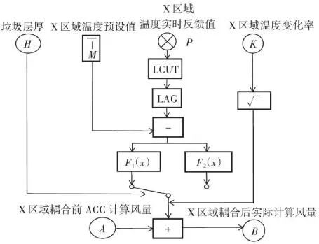 根據(jù)工藝設(shè)計和焚燒爐結(jié)構(gòu),從燃燒段至燃燼段前部為垃圾的燃燒區(qū)域,爐排底部依次有4行風(fēng)室,即圖7中所示2、3、4和5行風(fēng)室,每行各有3列,共計12個風(fēng)室。按照前述的項目實例,圖6中的12個紅外溫度測點,可以得到依次對應(yīng)12個風(fēng)室上部的火焰圖像和燃燒溫度。在傳統(tǒng)ACC系統(tǒng)中,一次風(fēng)的理論供風(fēng)量主要依據(jù)垃圾熱值、垃圾占比、蒸發(fā)量設(shè)定值、鍋爐熱效率等參數(shù)計算得到,在得到理論計算值后,會根據(jù)鍋爐負荷、垃圾料層厚度、垃圾濕度、燃燒和燃燼段上部溫度等參數(shù)的波動對理論計算值進行修正。其中溫度參數(shù)是由安裝在焚燒爐墻兩側(cè)的熱電偶反饋而來,爐溫?zé)犭娕嫉拈L度一般為1.0~1.3 m,除去爐墻壁厚,熱電偶露出爐內(nèi)的長度一般在250 mm左右,熱電偶材質(zhì)為鎳鉻-鎳硅,熱電偶前端耐磨頭長度為250~300 mm,耐磨頭材質(zhì)為鈷60。由于能夠反饋的溫度只能是熱電偶周圍溫度,因此會造成3點限制:①測點數(shù)量有限,若熱電偶數(shù)量增加,鍋爐開孔數(shù)量也要隨之上升,通常燃燒和燃燼區(qū)域安裝熱電偶數(shù)量為4~6支;②耦合性較高,抗干擾能力較低,其中的溫度修正系數(shù)雖然權(quán)重占比不大,但由于熱電偶數(shù)量有限,其單一溫度值對整體其他區(qū)域有連鎖影響,因此局部溫度與局部風(fēng)量無法一一獨立對應(yīng);③準確性存在衰減,熱電偶的原理是溫度信號轉(zhuǎn)換成熱電動勢信號,通過二次儀表呈現(xiàn)被測介質(zhì)溫度。而隨著磨損、腐蝕的加重,其準確性也逐漸衰減。其中鎳硅合金中的硅和鎳的優(yōu)先氧化是引起鎳鉻-鎳硅熱電偶熱電動勢超差、準確性降低的主要原因。根據(jù)上述內(nèi)容,我們在得到理論計算風(fēng)量之后,針對每一段風(fēng)室進行獨立的風(fēng)量修正。圖9中:M為對應(yīng)區(qū)域內(nèi)溫度設(shè)定值(℃);H為垃圾層厚度偏差百分比(%);P為對應(yīng)區(qū)域內(nèi)溫度實時反饋值(℃);K為對應(yīng)區(qū)域內(nèi)溫度變化率(℃/min);√ ̄為速度變化率高低限范圍(℃/min);LCUT為低切保護模塊(℃);LAG為高階濾波模塊(℃);A為理論計算風(fēng)量(m3/h);B為實際輸出計算風(fēng)量(m3/h)。