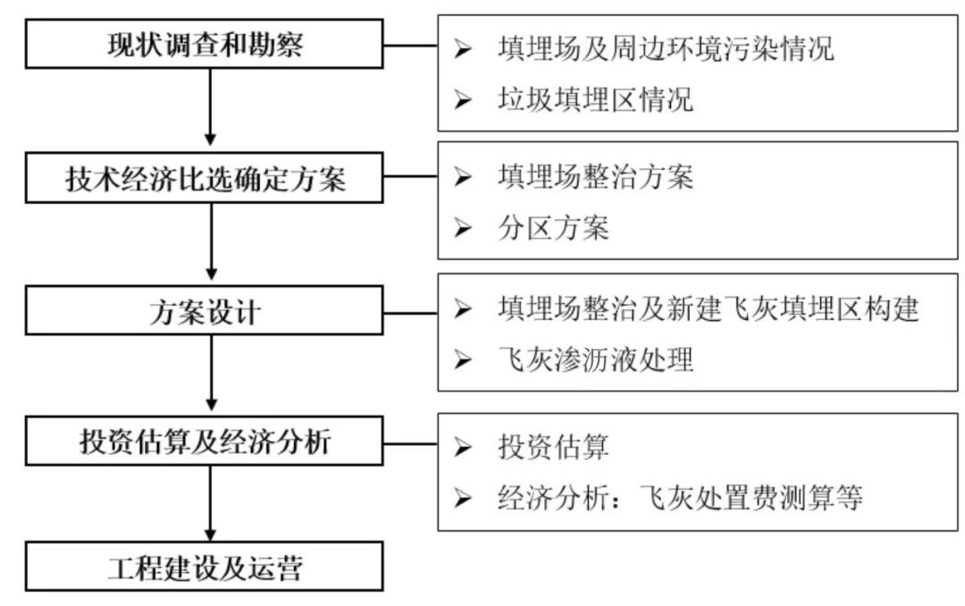 根據(jù)住房城鄉(xiāng)建設(shè)部發(fā)布的《2022年中國(guó)城市建設(shè)狀況公報(bào)》,截至2022年底,全國(guó)城市生活垃圾焚燒處理能力已達(dá) 80.46萬(wàn)噸/日,占比為72.53%。我國(guó)生活垃圾焚燒爐型主要為機(jī)械爐排爐和循環(huán)流化床,其中機(jī)械爐排爐飛灰產(chǎn)率一般為2%~5%,循環(huán)流化床飛灰產(chǎn)率一般為8%~15%。飛灰產(chǎn)率按3%~5%計(jì)算,則年產(chǎn)飛灰量約為881萬(wàn)~1468萬(wàn)噸。由于含有較高浸出濃度的重金屬和高毒性當(dāng)量的二噁英等有毒有害物質(zhì),生活垃圾焚燒飛灰被列入《國(guó)家危險(xiǎn)廢物名錄》。根據(jù)《2022年生態(tài)環(huán)境公報(bào)》,2022年工業(yè)危險(xiǎn)廢物產(chǎn)生量為9514.8萬(wàn)噸,飛灰占比約為9.2%~15.4%,飛灰產(chǎn)量較大。飛灰的妥善處置關(guān)系到生活垃圾焚燒廠的穩(wěn)定運(yùn)行,也是生活垃圾焚燒行業(yè)的難題和短板。目前,飛灰處置方式包括進(jìn)入危險(xiǎn)廢物填埋場(chǎng)填埋處置、固化/穩(wěn)定化處理后進(jìn)入生活垃圾填埋場(chǎng)填埋處置、水洗預(yù)處理后水泥窯協(xié)同處置、高溫熔融/玻璃化、高溫?zé)Y(jié)等,其中,固化/穩(wěn)定化處理后進(jìn)入生活垃圾填埋場(chǎng)填埋處置由于技術(shù)成熟且成本較低,是當(dāng)前飛灰處置的主流技術(shù)。填埋場(chǎng)分區(qū)改造建設(shè)必要性對(duì)于新建填埋場(chǎng)選址困難或飛灰產(chǎn)量較小的地區(qū),對(duì)現(xiàn)有生活垃圾填埋場(chǎng)進(jìn)行分區(qū)改造以滿足固化/穩(wěn)定化飛灰填埋要求是較為經(jīng)濟(jì)可行的方式。隨著生活垃圾焚燒發(fā)電廠的建成,現(xiàn)有生活垃圾填埋場(chǎng)將停止接收生活垃圾,若現(xiàn)有生活垃圾填埋場(chǎng)尚有可利用的剩余庫(kù)容,對(duì)其進(jìn)行分區(qū)改造,既可以充分發(fā)揮其稀缺資源作用,又可以解決生活垃圾焚燒廠的飛灰處置和大修期內(nèi)生活垃圾應(yīng)急處置問(wèn)題,同時(shí)還可以完善生活垃圾填埋場(chǎng)的現(xiàn)有設(shè)施并治理現(xiàn)存污染,可謂一舉多得。因此,分區(qū)改造項(xiàng)目的建設(shè)十分必要且具有意義。總的來(lái)說(shuō),項(xiàng)目的建設(shè)具有較好的經(jīng)濟(jì)、環(huán)保和社會(huì)效益,具體體現(xiàn)在:經(jīng)濟(jì)效益:固化/穩(wěn)定化飛灰填埋收益可部分覆蓋現(xiàn)有生活垃圾填埋場(chǎng)治理投資;環(huán)保效益:現(xiàn)有生活垃圾填埋場(chǎng)污染問(wèn)題得到改善、飛灰得到妥善處置;社會(huì)效益:填埋場(chǎng)原址改造,避免了新選址帶來(lái)的占用土地資源、搬遷、新的環(huán)境影響源等問(wèn)題。如前所述,生活垃圾填埋場(chǎng)分區(qū)改造具有填埋場(chǎng)治理及飛灰入場(chǎng)填埋的雙重屬性,因此,其建設(shè)流程可以參考生活垃圾衛(wèi)生填埋場(chǎng)封場(chǎng)治理、擴(kuò)建,并結(jié)合項(xiàng)目的實(shí)際情況及當(dāng)?shù)叵嚓P(guān)主管部門的要求進(jìn)行,從建設(shè)方案角度,推薦建設(shè)流程如下圖所示: