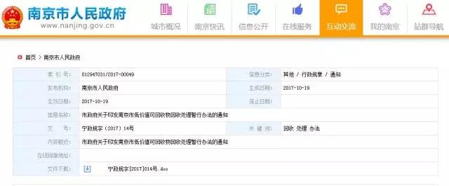 10月19日,南京市政府公布了《南京市低價(jià)值可回收物回收處理暫行辦法》,根據(jù)辦法規(guī)定,城市管理部門負(fù)責(zé)管理轄區(qū)內(nèi)低價(jià)值可回收物回收工作,并通過政府采購方式向企業(yè)購買低價(jià)值可回收物的回收、處理服務(wù)。辦法自今年11月20日起施行,有效期3年。