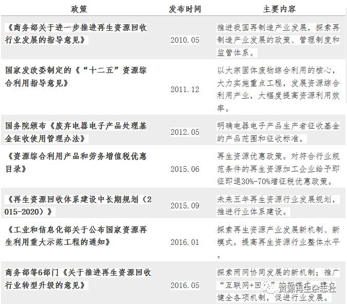 社會經(jīng)濟的高速發(fā)展帶來了國民生活水平的不斷提高,同時也伴隨著廢舊物資產(chǎn)生量的大幅上升,為我國再生資源產(chǎn)業(yè)的發(fā)展提供了良好的發(fā)展機遇。由于產(chǎn)業(yè)空間巨大,對社會經(jīng)濟以及環(huán)境保護的推動效應(yīng)明顯,近年來國家陸續(xù)出臺多項政策扶持產(chǎn)業(yè)發(fā)展。