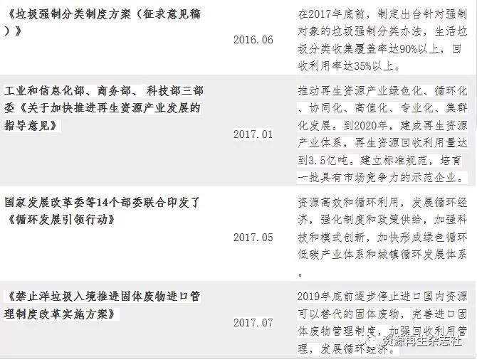 2015年7月,國務(wù)院發(fā)布《國務(wù)院關(guān)于積極推進“互聯(lián)網(wǎng)+”行動的指導(dǎo)意見》,引導(dǎo)再生資源回收行業(yè)向信息化、自動化、智能化方向發(fā)展,促進再生資源交易透明化、便利化。2016年5月,商務(wù)部等國家六部委印發(fā)了《關(guān)于推進再生資源回收行業(yè)轉(zhuǎn)型升級的意見》。強調(diào)推廣“互聯(lián)網(wǎng)+回收”的新模式;建立完善各項機制,促進行業(yè)發(fā)展。